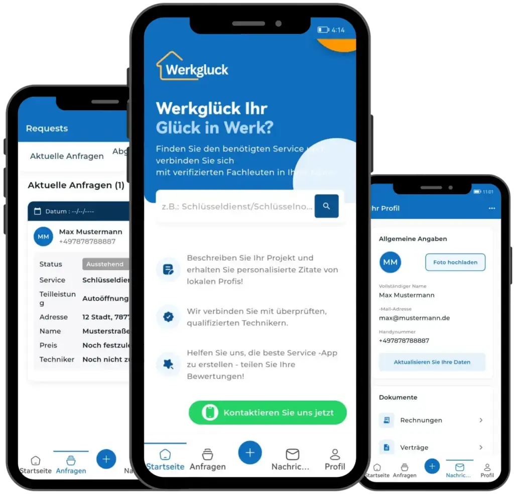 Der Preis kommt direkt nach Ihrer Anfrage – sofort und transparent. Sie können jedes Angebot einfach annehmen oder ablehnen. Alle Rechnungen bleiben übersichtlich in der App gespeichert. Objekte verwalten und alles aus einer Hand buchen – in nur 3 Klicks. Anfragen jederzeit verfolgen, beschreiben und mit Bildern erweitern.